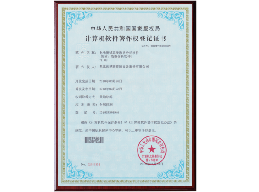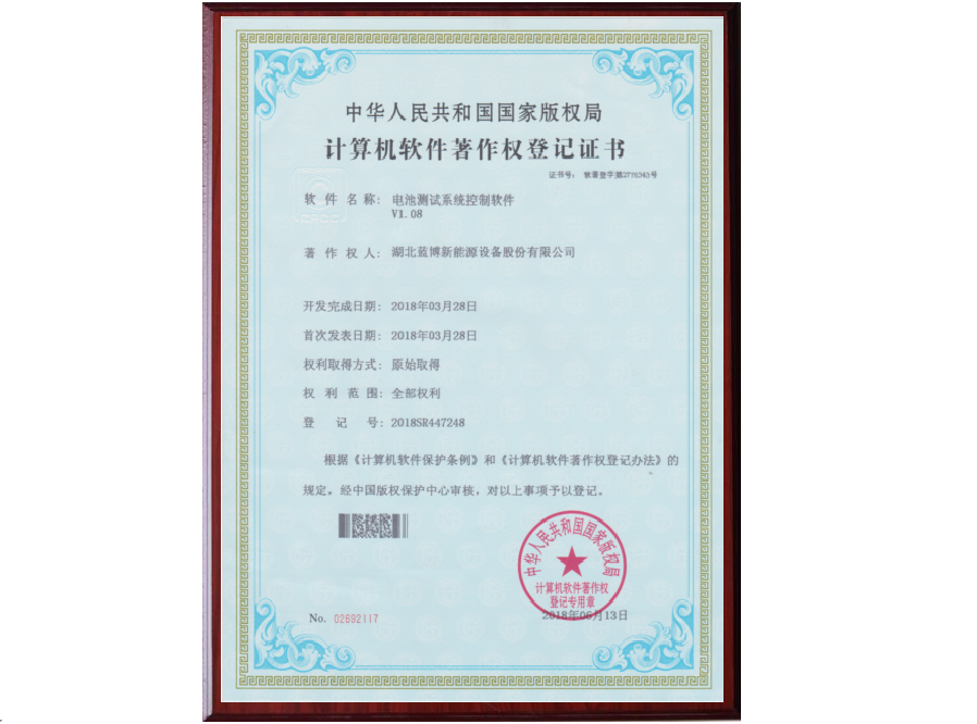 根據(jù)《計算機軟件保護條例》和《計算機軟件著作權登記辦法》的規(guī)定,經(jīng)中國版權保護中心審核,中華人民共和國國家版權局對藍博公司提交的電池測試系統(tǒng)軟件著作權認定為原始取得并予以登記,從頒證之日起,這套電池測試系統(tǒng)軟件的版權將得到中國版權保護中心的有效保護。