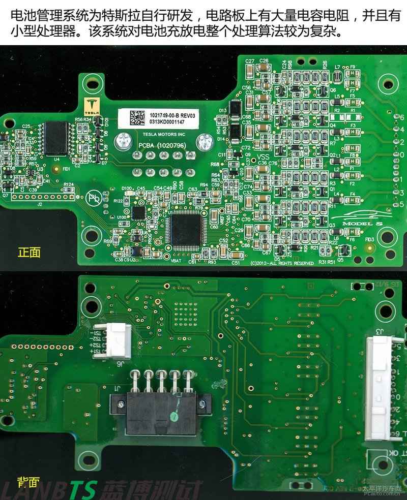 電池管理系統(tǒng)主要功能包括數(shù)據(jù)采集、電池狀態(tài)計(jì)算、能量管理、熱管理、安全管理、均衡控制和通信功能等。從電路圖上可看到,電池管理系統(tǒng)為特斯拉自行研發(fā),擁有高度的知識(shí)產(chǎn)權(quán)的核心技術(shù)。該系統(tǒng)能自行處理充放電以及發(fā)熱問題。相信國內(nèi)廠商較難山寨出來。